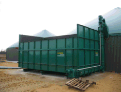 Delivery to the digester is performed by a vertical spiral conveyor screw that transfers the biomass to an inclined digester screw. This feeds the substrate into the digester safely below the level of the liquid. Of course, it is also possible to feed 2 digesters.